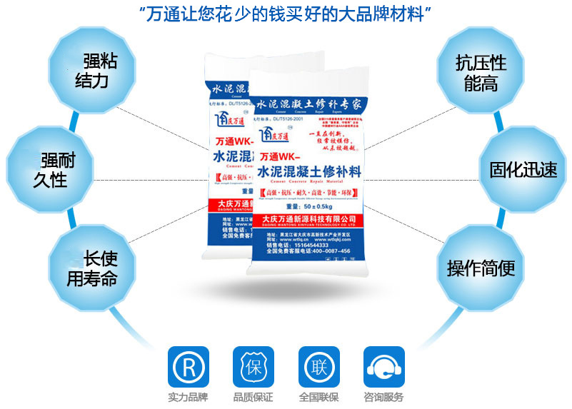 大慶萬(wàn)通新源科技有限公司獨(dú)有的混凝土路面高強(qiáng)速補(bǔ)料,是水泥混凝土路面病害修復(fù)的好材料。疲勞、凍融循環(huán)、彎曲壓力、滲水和基層破壞等原因都會(huì)引起水泥路面的破損,從而帶來(lái)高昂的維護(hù)費(fèi)用。與以往的剛性修補(bǔ)方法不同,混凝土水泥路面維修速補(bǔ)膠提供了一種獨(dú)特的柔性修補(bǔ)產(chǎn)品和技術(shù),高柔性、高抗拉性,可跨伸縮縫施工和高抗壓性使得混凝土快補(bǔ)產(chǎn)品為水泥混凝土路面提供了******性的修補(bǔ)。傳統(tǒng)的剛性修補(bǔ)方案,如環(huán)氧砂漿和快干水泥產(chǎn)品,由于其自身的粘結(jié)失效,抗疲勞性低以及與原路面不同的伸縮系數(shù),修補(bǔ)面會(huì)在短時(shí)間內(nèi)失效或產(chǎn)生新的裂縫,需要反復(fù)修補(bǔ),有效期短且費(fèi)用高昂。大慶萬(wàn)通新源科技有限公司的混凝土水泥路面維修速補(bǔ)膠可以隨原路面一起伸縮,移動(dòng),從而避免了粘結(jié)失效和產(chǎn)生新裂縫。萬(wàn)通快補(bǔ)產(chǎn)品優(yōu)異的粘結(jié)性、柔韌性和高防滑性,特別適用于水泥路面的淺層粘合修補(bǔ),多邊角混凝土板層修補(bǔ),跨伸縮縫修補(bǔ)以及路面沉陷修補(bǔ)。萬(wàn)通混凝土病害修補(bǔ)料針對(duì)混凝土起皮起沙、斷板裂縫、蜂窩麻面、坑槽露石子、漏筋掉皮、橋梁的掉皮漏筋快速通車使用時(shí)間長(zhǎng)。應(yīng)用萬(wàn)通快補(bǔ)產(chǎn)品,施工后一天就可以恢復(fù)交通。大慶萬(wàn)通新源科技有限公司的萬(wàn)通水泥路面維修速補(bǔ)膠適用于高速公路、機(jī)場(chǎng)路面、農(nóng)村村村通路面、廠坪、學(xué)校操場(chǎng)、市區(qū)公路、小區(qū)路面、橋梁、水泥路面的修補(bǔ)。使用萬(wàn)通特快補(bǔ)材料修補(bǔ)路面可以一勞永逸! 水泥地面起砂怎么辦,混凝土修補(bǔ)劑混凝土地面起砂,混凝土地面修補(bǔ),地面起砂怎么辦,